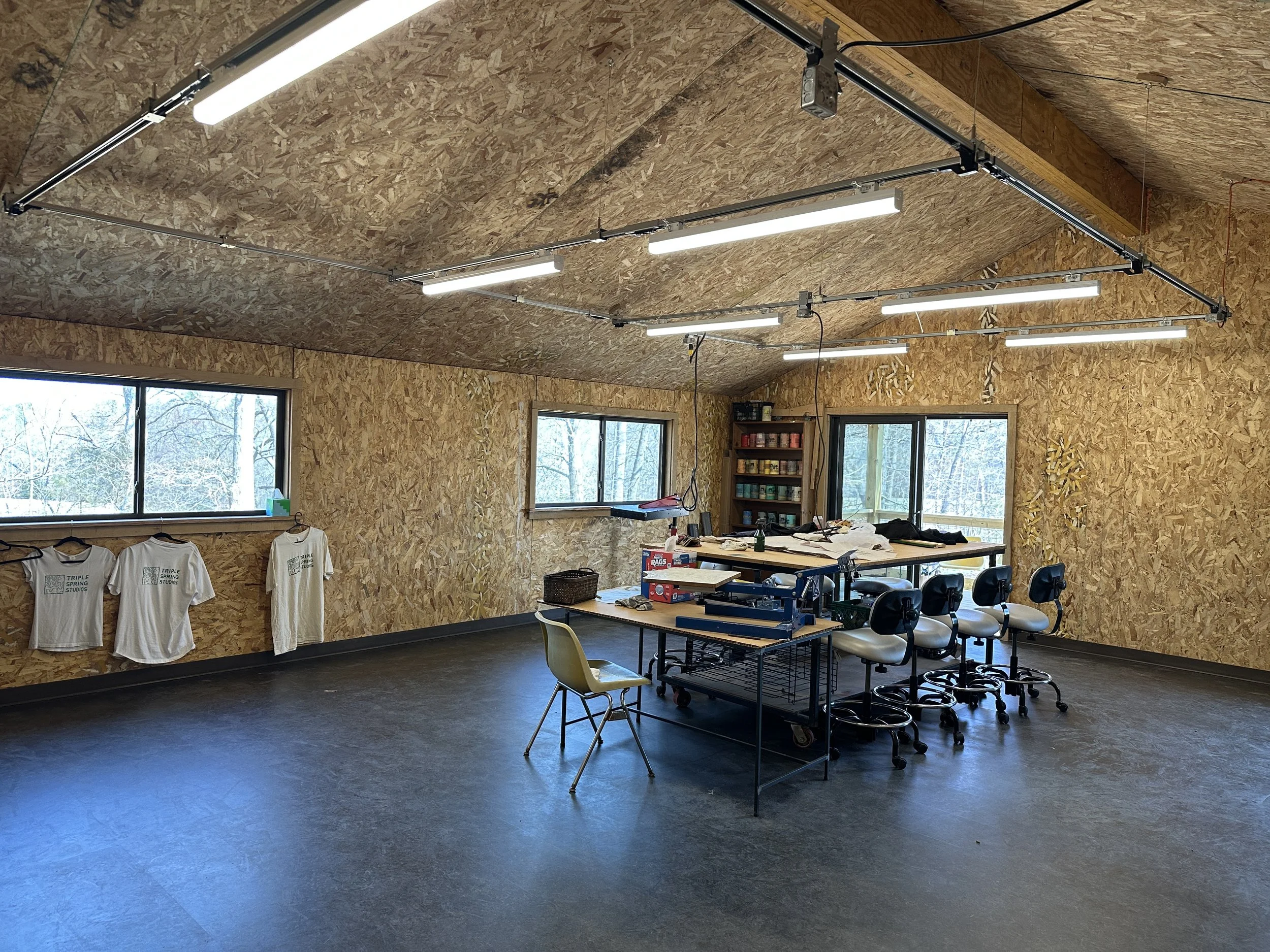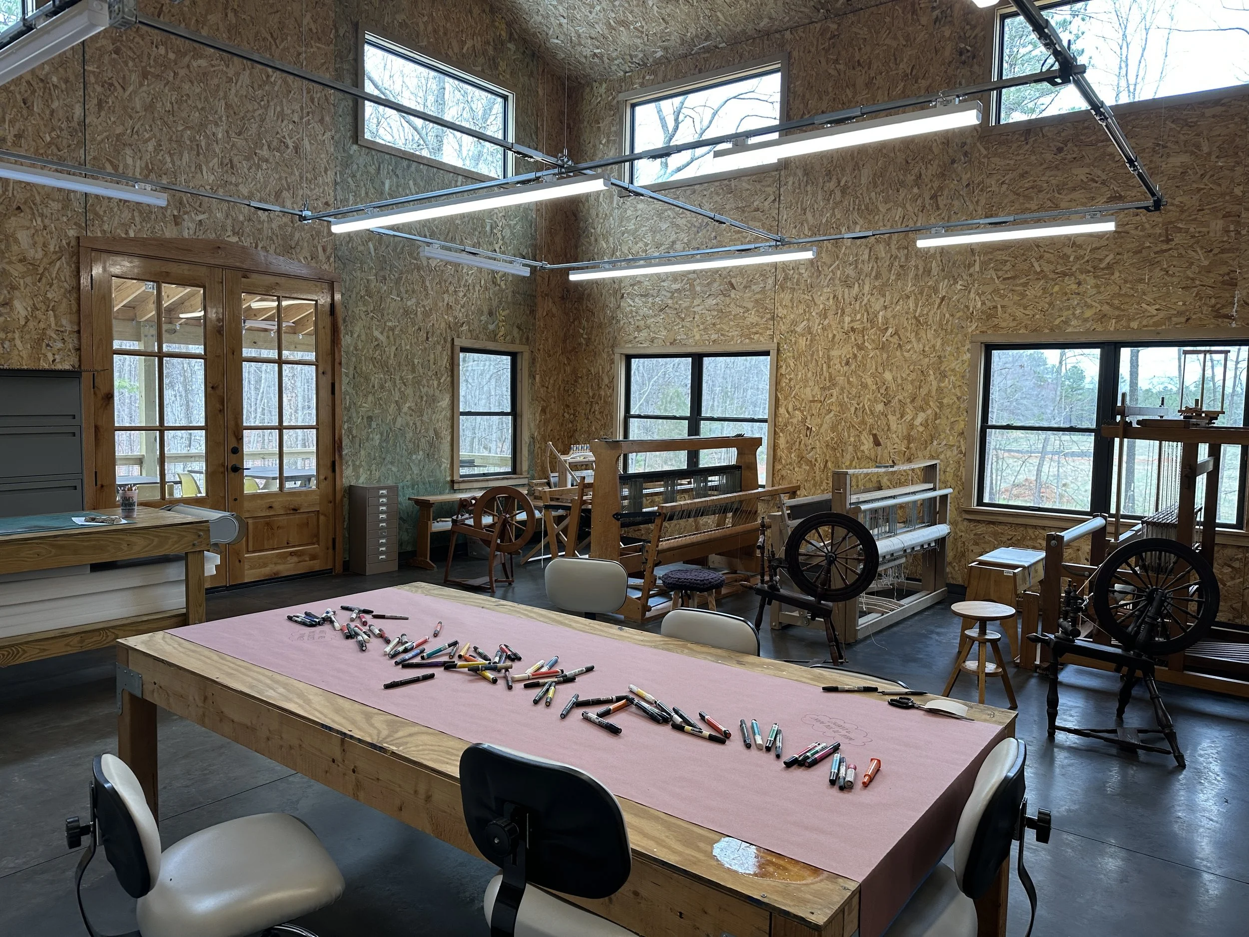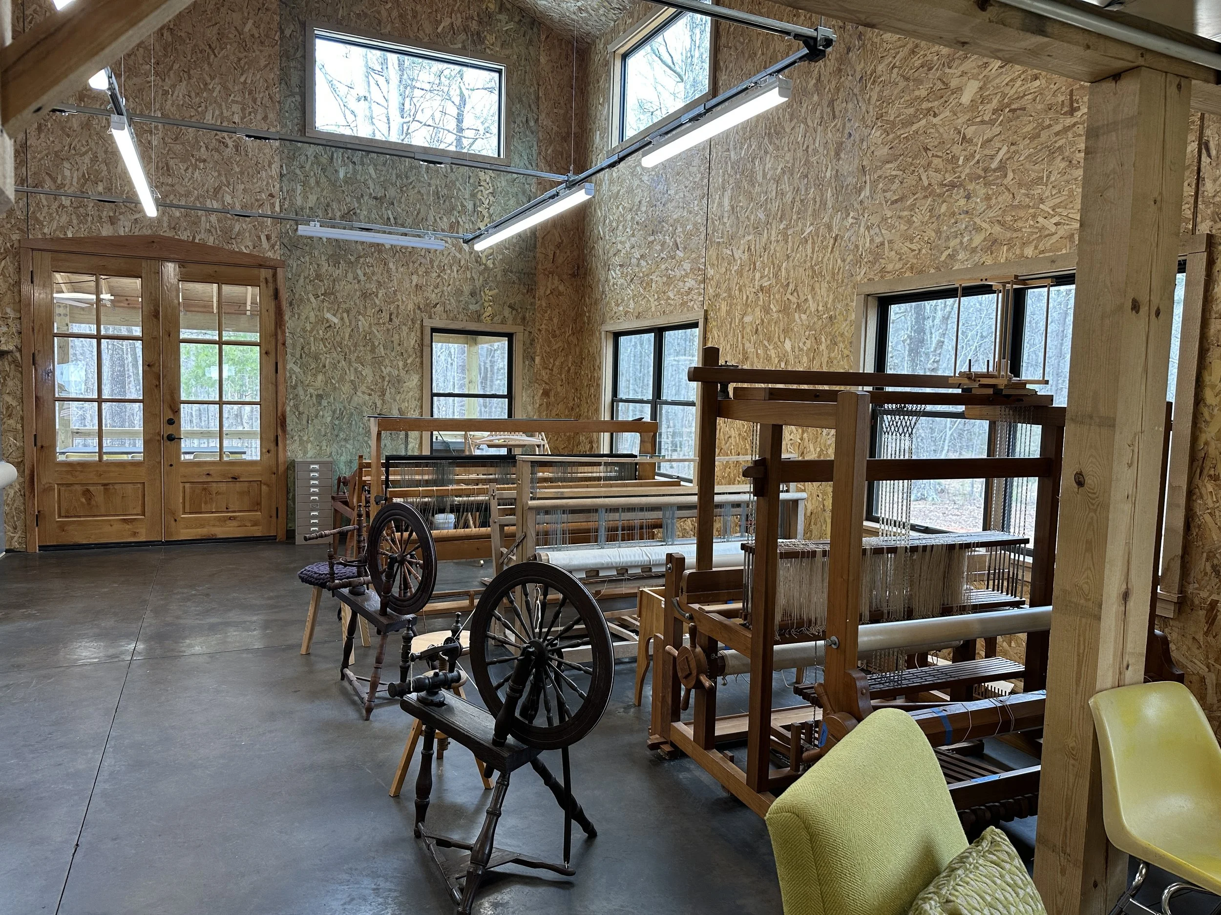 The studio address is 6601 Morrow Mill Rd, Chapel Hill, NC. The building is on a gravel driveway, and there are ramps over the thresholds of the front and back doors. The fibers studio, metals studio, lounge, kitchen, and shop are all on the first floor. The print studio and private studios are up a flight of stairs. There is bathroom access on both floors.