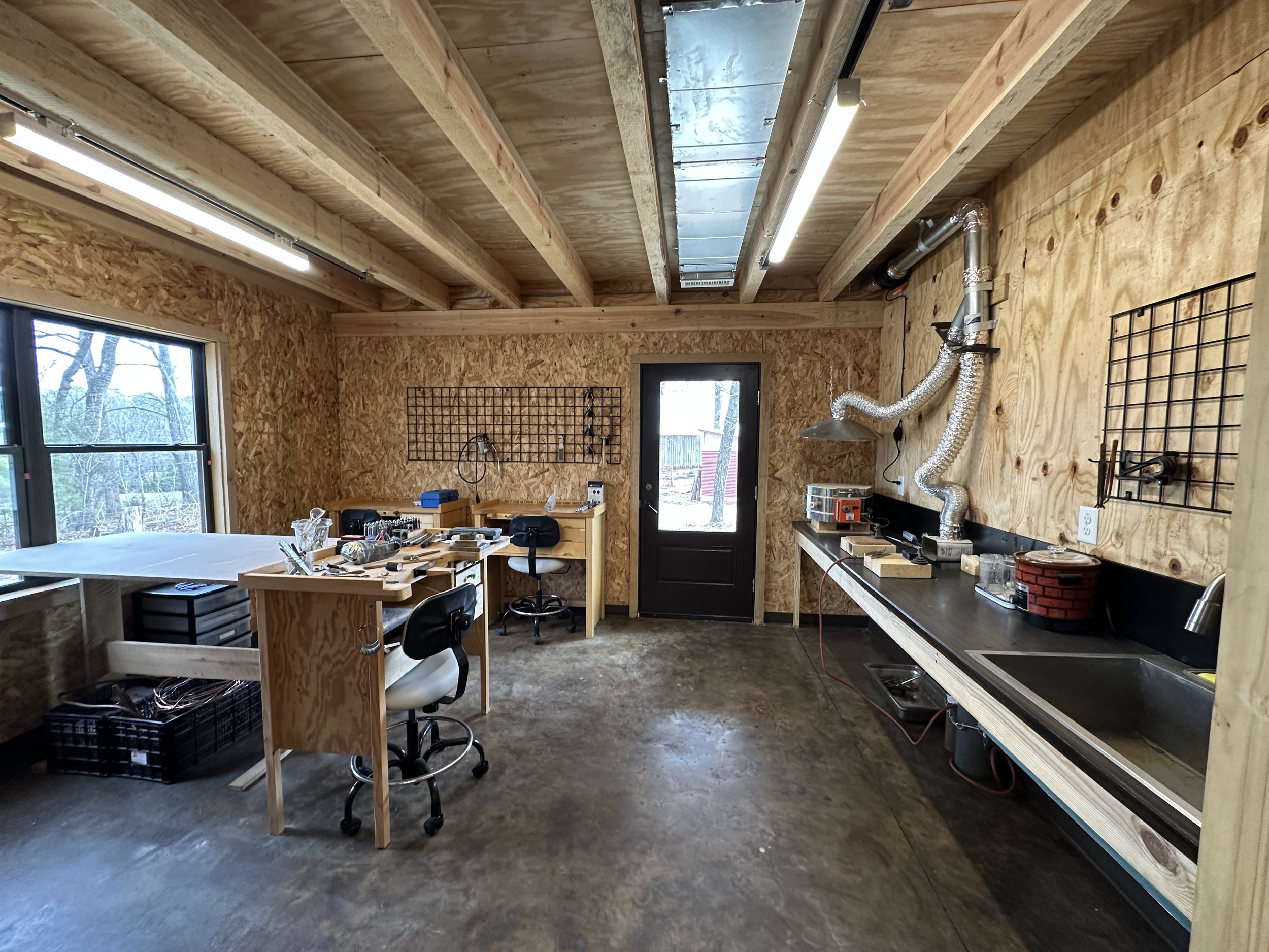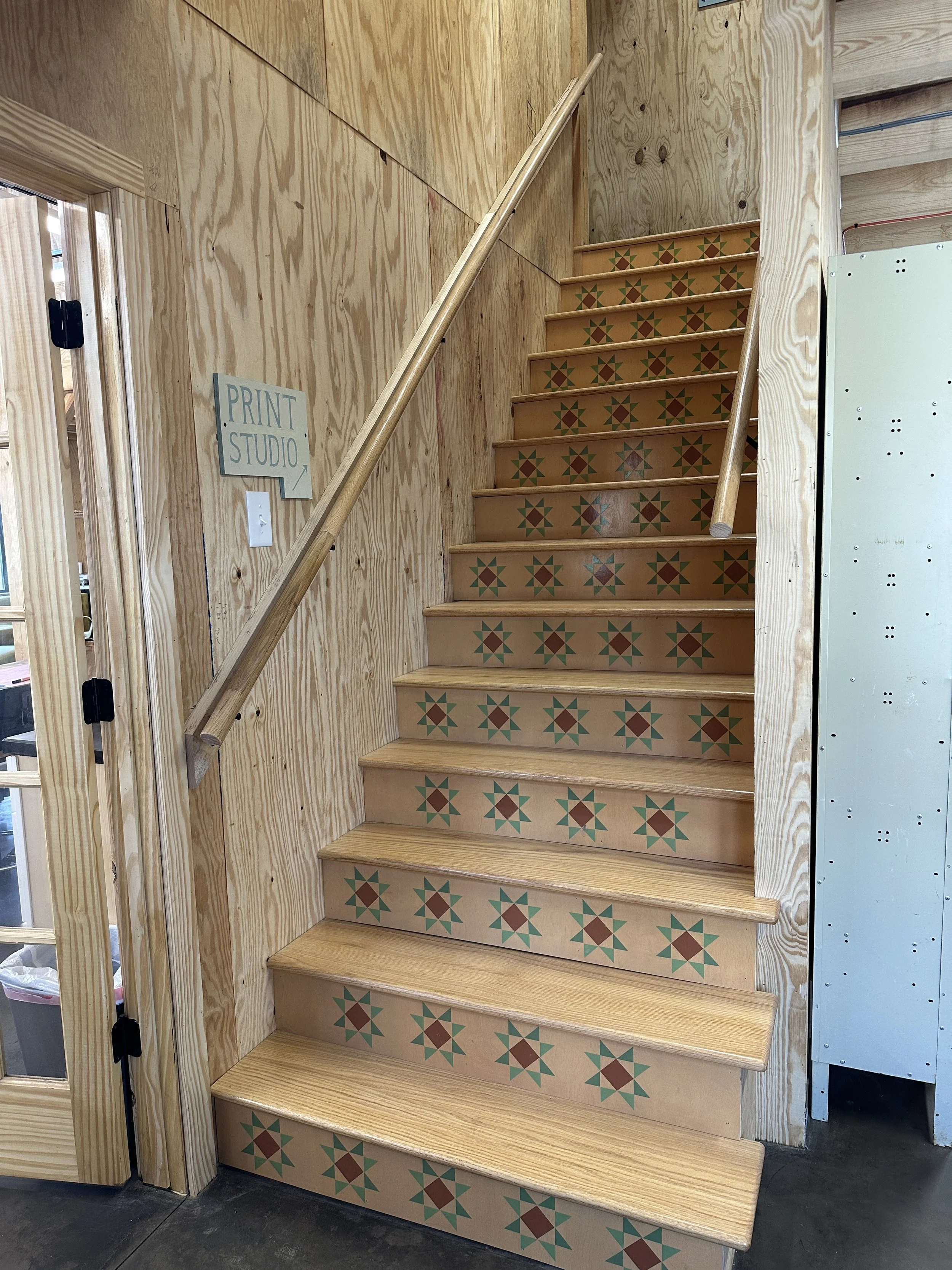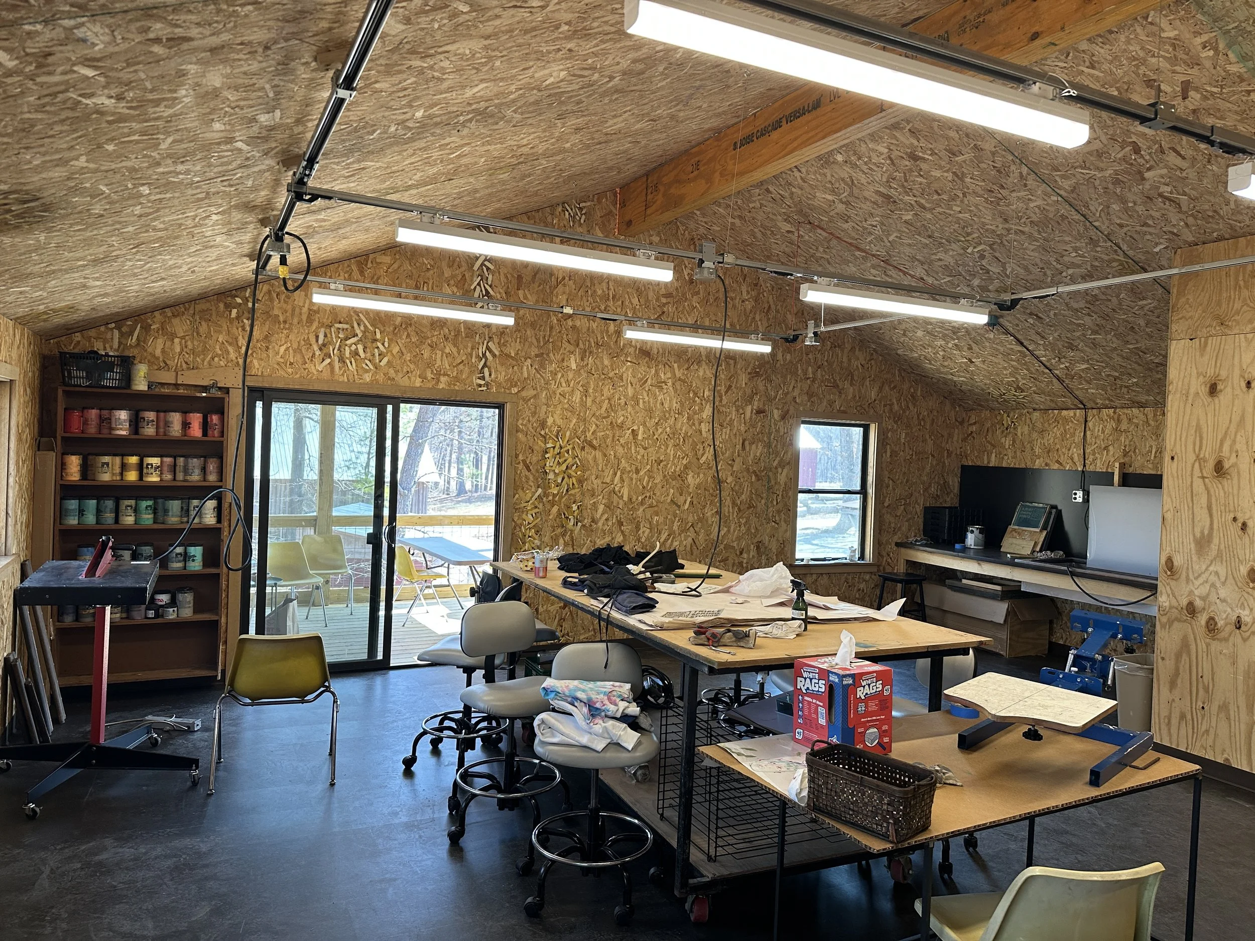 The studio address is 6601 Morrow Mill Rd, Chapel Hill, NC. The building is on a gravel driveway, and there are ramps over the thresholds of the front and back doors. The fibers studio, metals studio, lounge, kitchen, and shop are all on the first floor. The print studio and private studios are up a flight of stairs. There is bathroom access on both floors.