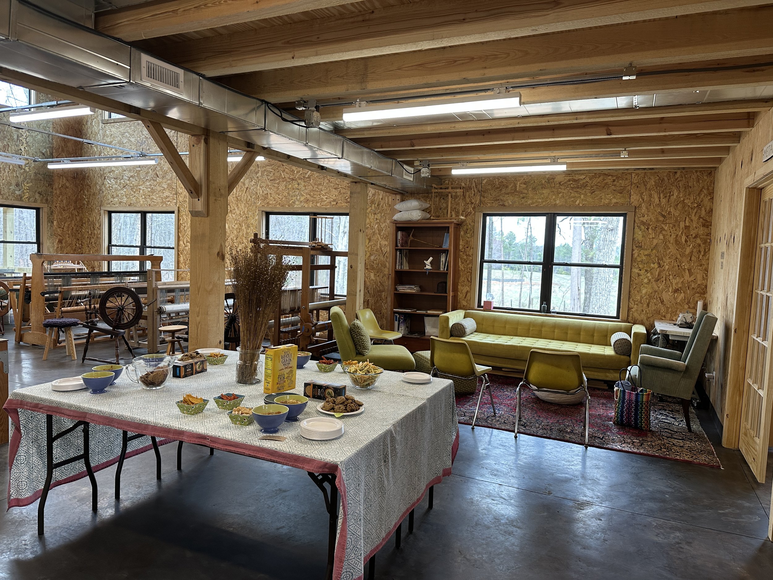 We have a variety of outdoor and indoor spaces. We encourage folks to mask indoors, as this keeps our operations safer and more accessible to everyone, regardless of immunocompromised status. We also have air filters for indoor workshops, and screened windows for improving airflow. We keep lots of seats around, and students should always feel free to pull up a chair if they don’t have one already.